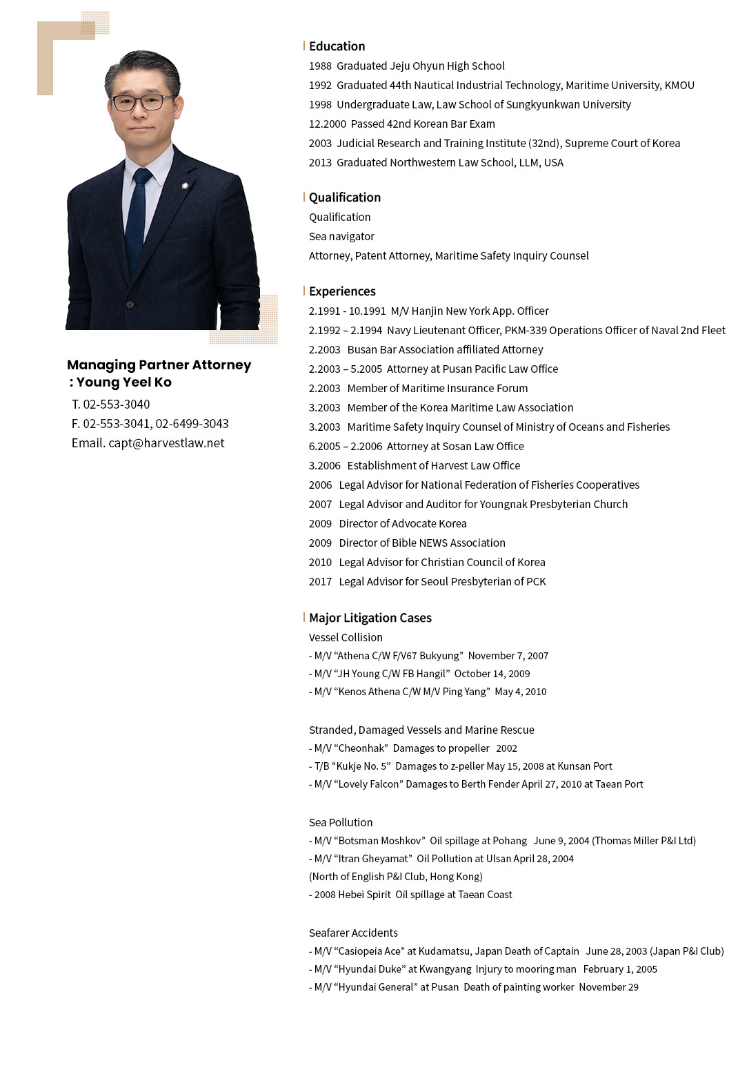 Corporate Registration No.: 3698800509 | Managing Partner: Young Yeel Ko | Tel: +82-2-553-3040 | Fax: +82-2-553-3041,+82-2-6499-3043 | E-mail: capt@harvestlaw.net